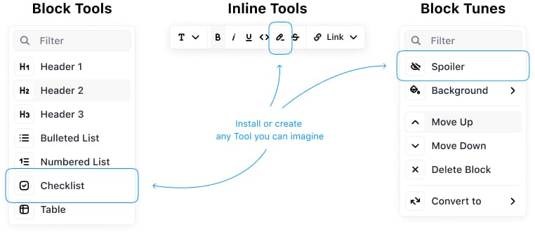 Every block is powered by plugins — easy to create your own. Explore dozens of ready-made options for blocks, inline formatting, and block tunes.
