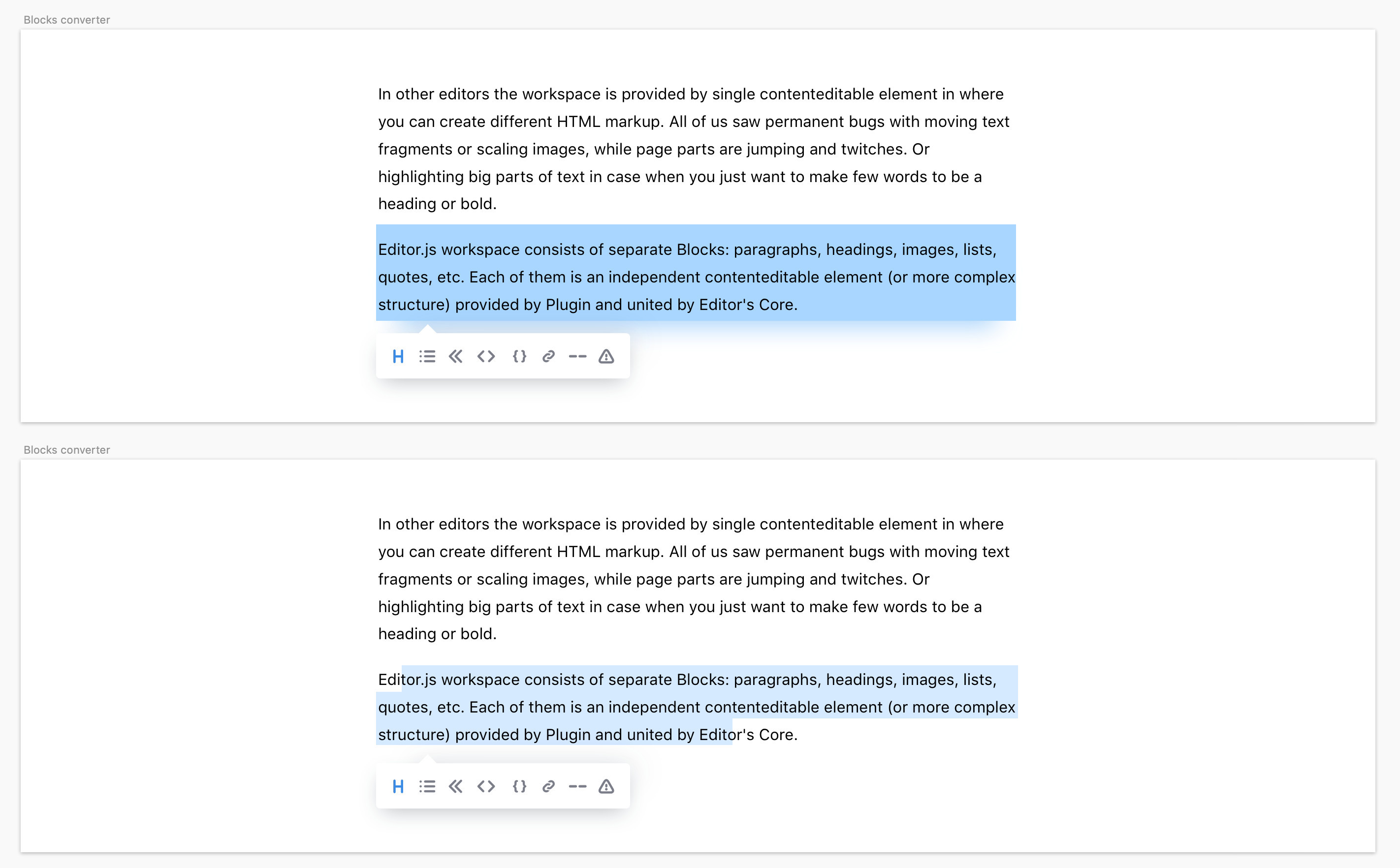 Editor.js has a Conversion Toolbar that allows user to convert one Block to another.
